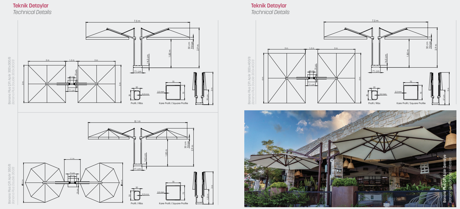 With its double-headed canopy and single rear-mounted base, it can cover 18 square meters of space by fully opening the center of the two umbrellas, or 36 square meters with our 4-pole model. The Banana side-pole double-opening umbrella offers a practical, durable, and aesthetic solution.